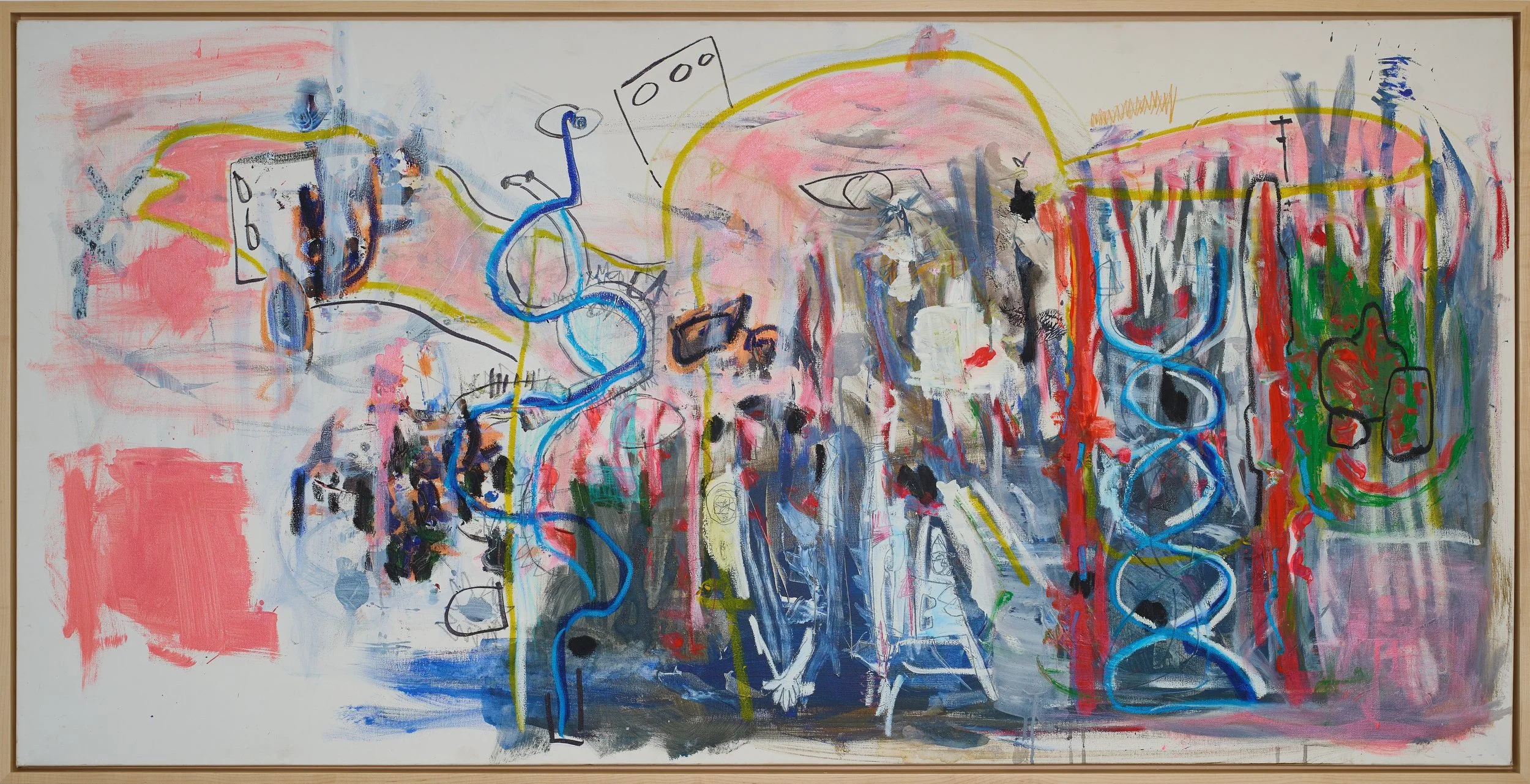 i saw an invisible embrace on the playground, next to pier 21 on my empty walk, it spoke in long bright waves: “people will be confusing, you will be confusing, meanness is just all the knots inside, behind, twisting into an elephant that doesn’t know how he got here and he wants to dissolve back to heaven and we just have to untie the knots” (2024) 6x3 ft, mixed media on canvas, natural maple frame