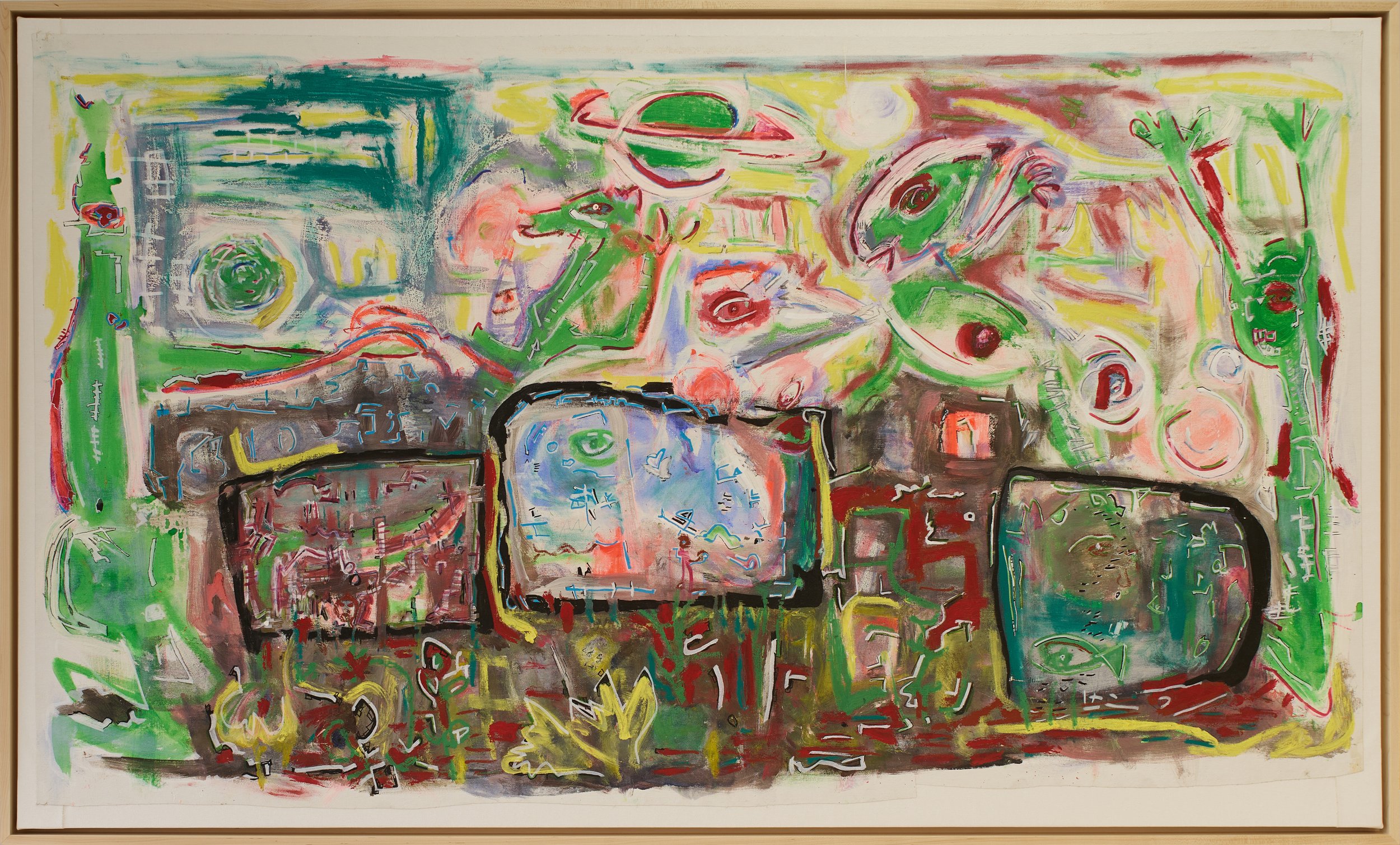 (2024) 6x4 ft, mixed media on canvas, natural maple frame