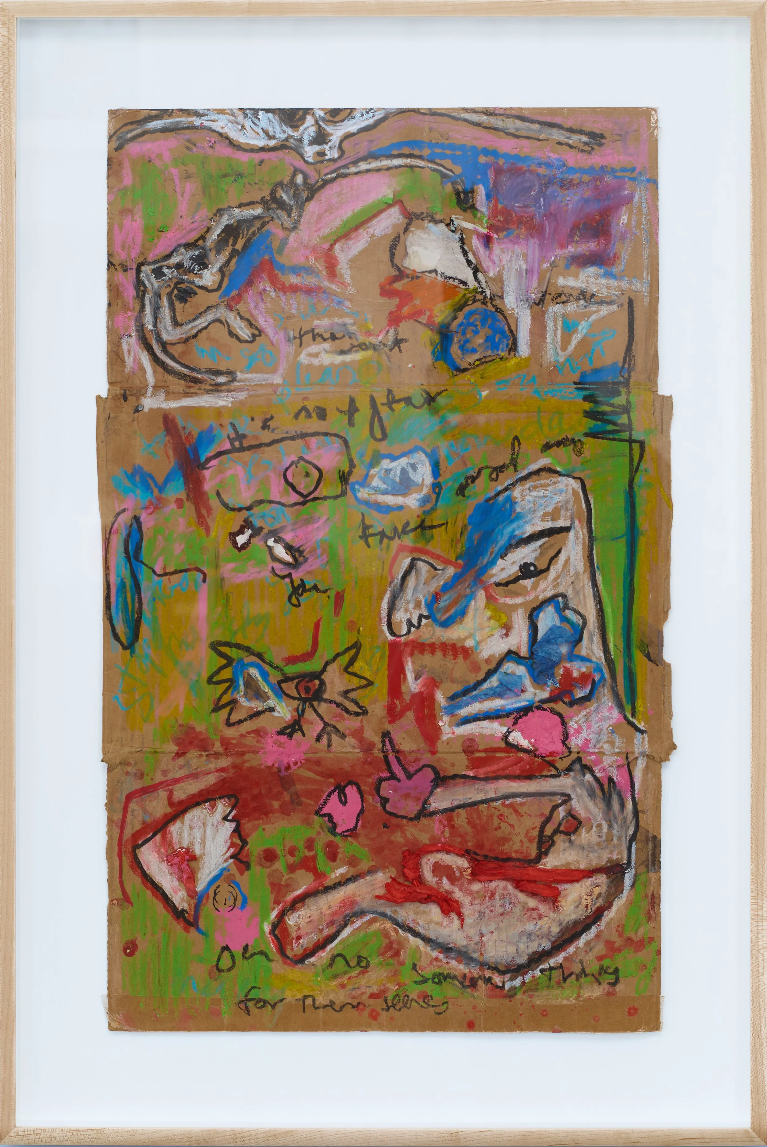 oh no! someone thinks for them seeing (2026) 16x27 inches, oil pastel, papier mache, paint marker on cardboard